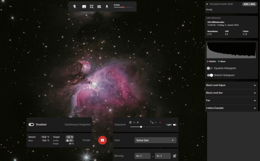 Capture breathtaking images of star clusters, nebulae, and distant galaxies using sequence-controlled exposures with or without dithering. By applying standard RGB filters or narrowband filters such as Hα and OIII, you can produce striking color composite images – including those in the iconic “Hubble look.”